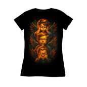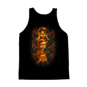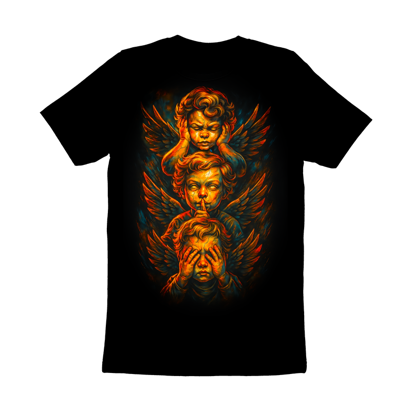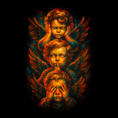 This image features a striking vertical composition of three cherubic figures, each embodying a facet of the classic 'hear no evil, speak no evil, see no evil' motif. The top cherub covers its ears, the middle places a finger over its lips, and the bottom covers its eyes, creating a powerful visual narrative. The artistry employs a rich, fiery color palette dominated by oranges, reds, and yellows, contrasted with deep blues and blacks to accentuate the dramatic lighting and shadows. The texture is reminiscent of a classical painting, with visible brushstrokes adding depth and dimension. The overall effect is both haunting and beautiful, blending innocence with an undercurrent of solemnity.
