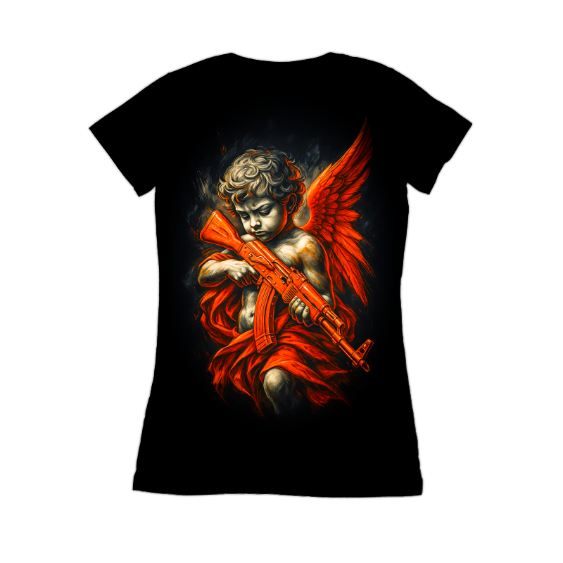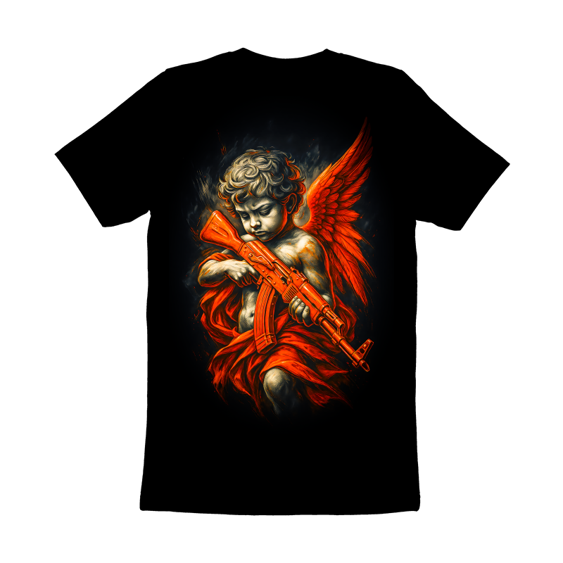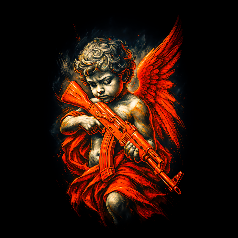 This artwork presents a striking juxtaposition of innocence and aggression. A cherubic figure, reminiscent of classical depictions of Cupid, is rendered with meticulous detail, from the soft curls of its hair to the delicate folds of the draped fabric. However, instead of the traditional bow and arrow, this Cupid wields an AK-47, painted in a vibrant shade of red that pops against the dark background. The contrast between the angelic figure and the weapon of war creates a powerful visual statement, prompting reflection on themes of love, violence, and the corruption of innocence. The dynamic lighting and dramatic composition further enhance the impact of the piece, making it a compelling and thought-provoking work of art. The overall style is reminiscent of baroque paintings but with a modern, edgy twist. Designers could use this image to create provocative and edgy designs for t-shirts, posters, or album art. It would appeal to audiences interested in counter-culture, street art, or commentary on contemporary issues. The image's bold contrast and striking symbolism make it ideal for designs that aim to make a statement and challenge conventional norms.