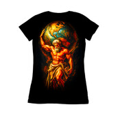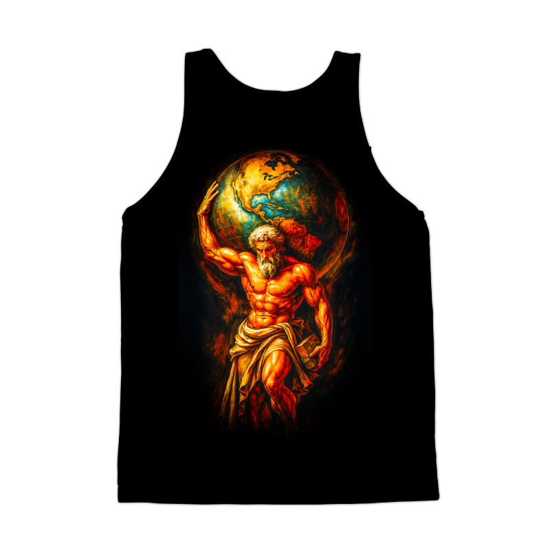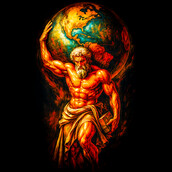 This artwork depicts Atlas, the Titan of Greek mythology, bearing the weight of the world upon his shoulders. Rendered in a dramatic, painterly style, the image emphasizes Atlas's muscular physique and the immense strain of his burden. The globe he supports is vividly colored, showcasing the continents and oceans in swirling hues. The color palette is dominated by fiery oranges, reds, and yellows, creating a sense of heat and intensity. Atlas himself is portrayed with a determined expression, his face etched with the weight of responsibility. A simple white cloth drapes around his waist, adding a touch of classical elegance to the powerful scene. The background is a stark black, which accentuates the glowing figure and the globe, drawing the viewer's eye to the central subject. The overall effect is both awe-inspiring and poignant, capturing the essence of Atlas's eternal struggle.