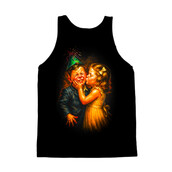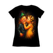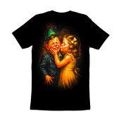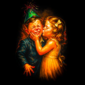 This design captures a comical yet endearing moment between two children at what appears to be a birthday celebration. The boy, donning a green party hat, winces with a forced smile as a girl plants a kiss on his cheek. The artwork is rich with exaggerated expressions and vibrant colors, reminiscent of classic illustration styles. The artist skillfully uses light and shadow to emphasize the characters' emotions and the texture of their clothing. The girl's golden dress and the boy's blue suit are rendered with a painterly quality, adding depth and visual interest to the scene. The overall composition evokes a sense of nostalgia and childhood innocence, making it a potentially appealing design for various applications.