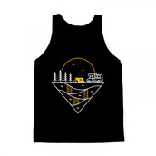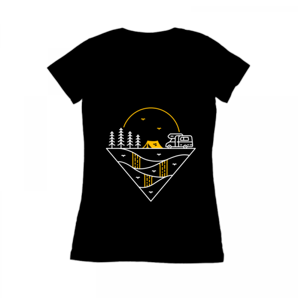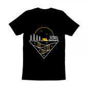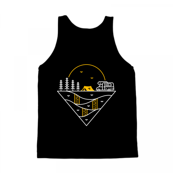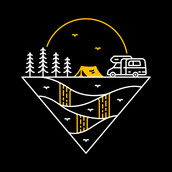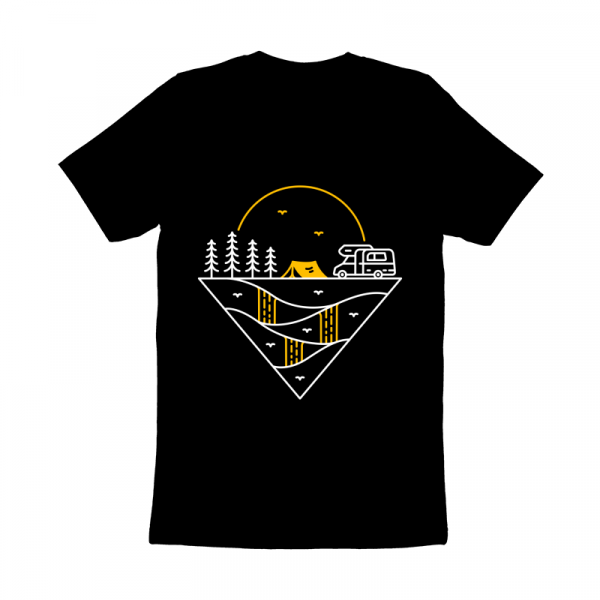 Camp Journey Begins is a monoline illustration that is suitable for apparel or merchandise about summer, vacation, holiday, van, camper van, camping, nature, outdoor, mountain, national park, adventure, travel, tent, journey, explore.