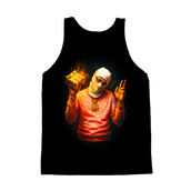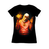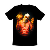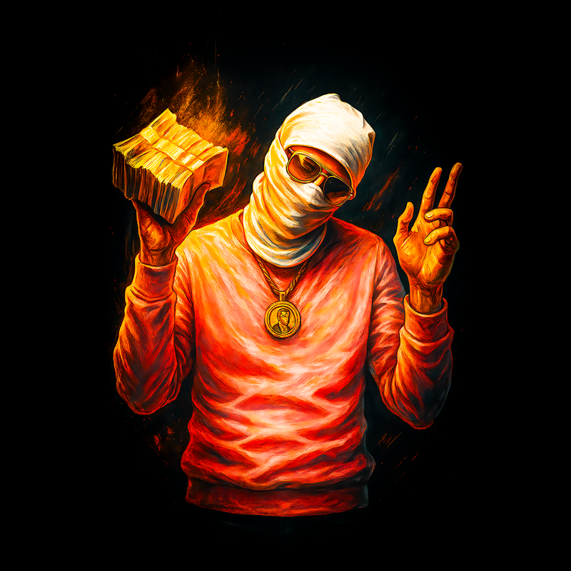 This design features a character holding a stack of money, exuding an air of mystery and wealth. The figure is depicted with a white wrap concealing their face, paired with reflective sunglasses that add to their enigmatic persona. The character is adorned with a gold chain and medallion, further emphasizing their affluent status. They hold a thick stack of cash in one hand and flash a peace sign with the other. The color palette is dominated by warm tones, with oranges and yellows creating a sense of heat and intensity, set against a dark background that enhances the contrast and focuses attention on the subject. The overall style has an illustrative quality, with detailed shading and texture that brings the character to life.