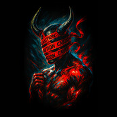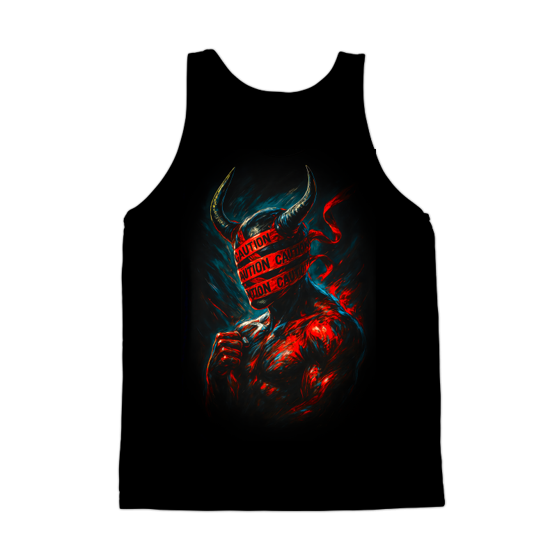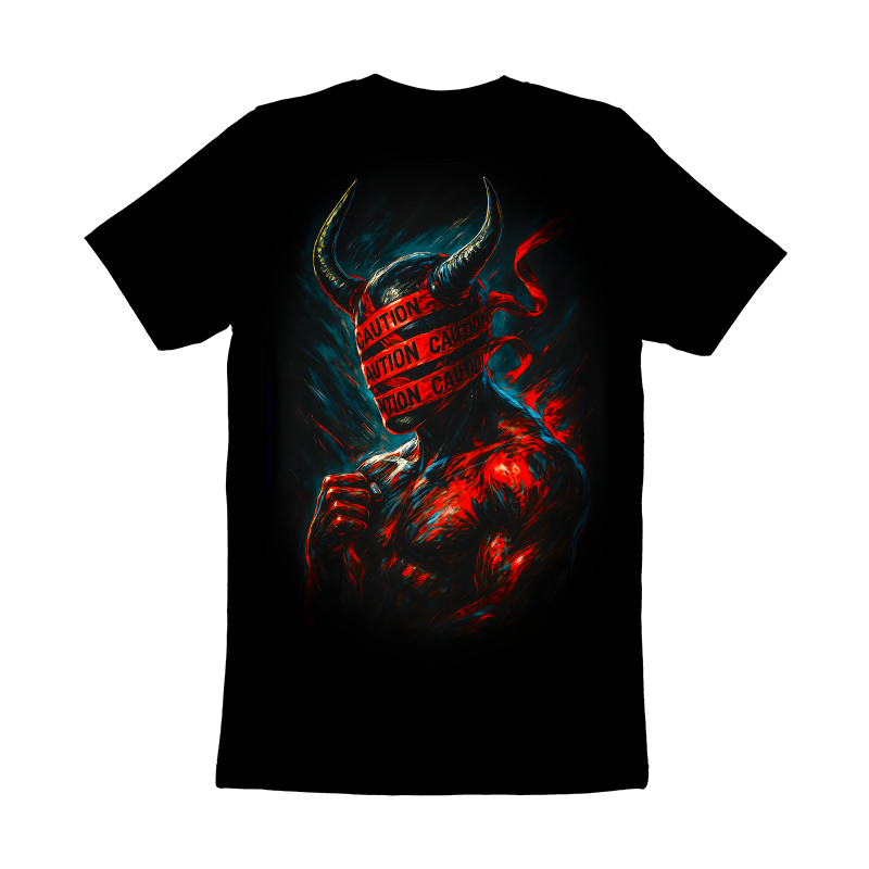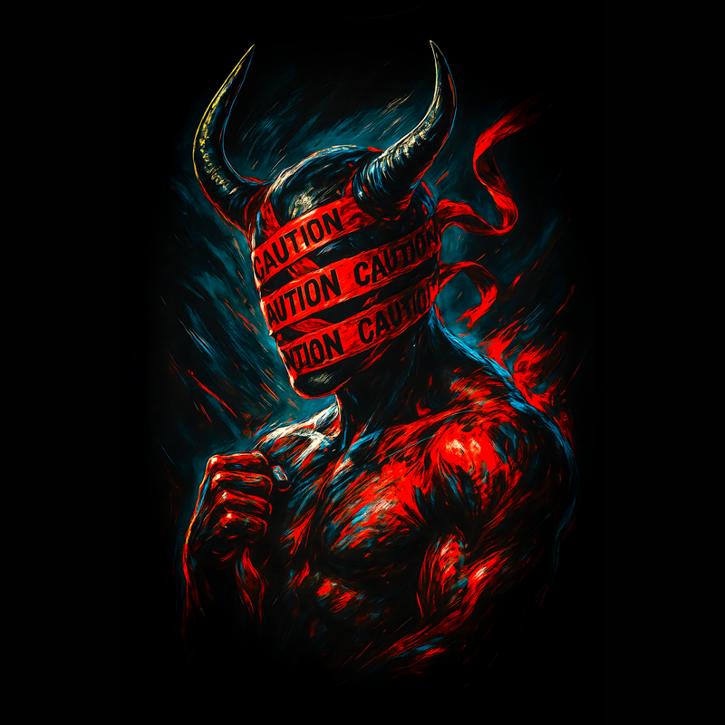 This design features a muscular, demonic figure shrouded in an aura of danger and mystery. The figure's head is obscured by 'CAUTION' tape, adding a layer of intrigue and warning. Bold strokes and a dynamic color palette of reds, blues, and blacks create a sense of intensity and drama. The design blends elements of horror and the grotesque with a touch of the contemporary, making it visually striking and thought-provoking. The caution tape element gives a sense of modern danger, while the demonic figure nods to classic horror tropes. The overall effect is both unsettling and captivating, drawing the viewer into a world of dark fantasy and cautionary tales. Designers could use this image to create eye-catching graphics for horror-themed events, edgy apparel, or even as part of a promotional campaign for a suspenseful movie or video game. The striking visuals and unique combination of elements make it suitable for a variety of applications where a dark, attention-grabbing design is needed.