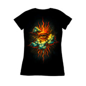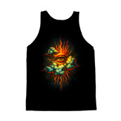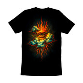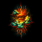 This striking design features a central, stylized eye surrounded by vibrant, swirling clouds and bursts of light. The color palette is dominated by warm oranges, yellows, and reds, contrasting with cool blues and greens in the cloud formations. The eye itself is rendered with careful attention to detail, creating a focal point that draws the viewer in. The overall effect is ethereal and mystical, evoking a sense of cosmic awareness and otherworldly beauty. The composition is symmetrical and balanced, with the eye at the center and the clouds and light radiating outwards. The dark background enhances the vibrancy of the colors and creates a sense of depth and mystery.