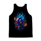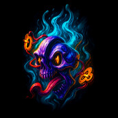 This striking design features a vividly colored skull with an open mouth and extended tongue, set against a backdrop of swirling blue flames. The skull is rendered in shades of purple and blue, creating a visually arresting effect. The eyes glow with an eerie orange light, adding to the design's macabre appeal. Attached to the skull are two golden keys, connected by a winding red cord, which adds an element of mystery and intrigue. The artwork is highly detailed, with intricate shading and texture that give it a three-dimensional quality. The design style is reminiscent of tattoo art, with bold lines and vibrant colors that make it stand out.