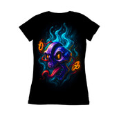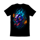 Designers could use this image for a variety of purposes, including t-shirt designs, posters, and album art. The bold colors and striking imagery would make it a great fit for edgy or alternative brands. It could also be used for Halloween-themed products or designs related to music, gaming, or horror.