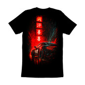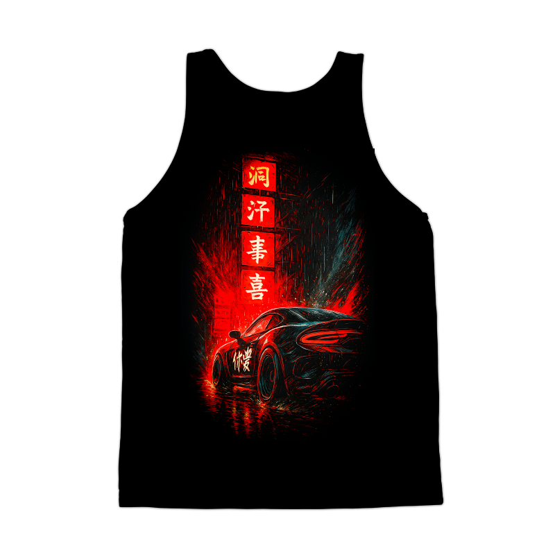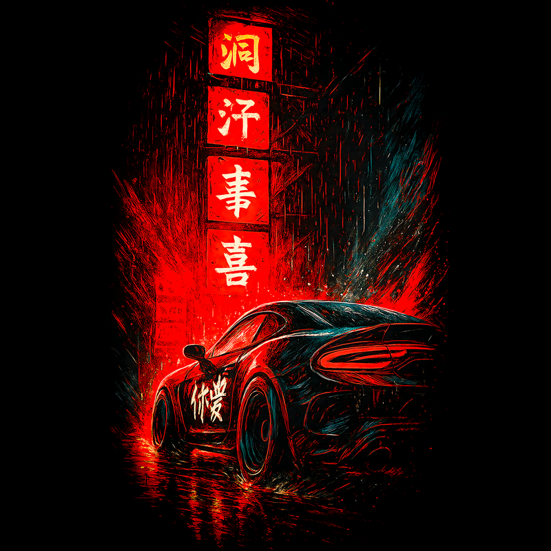This design captures a sleek, modern sports car parked on a wet street in a futuristic urban setting. The aesthetic is heavily influenced by cyberpunk and neon noir styles, with vibrant red and teal hues dominating the color palette. Rain streaks add to the atmosphere, reflecting the bright lights of the city. Above the car, glowing signage in Asian characters enhances the design's exotic, high-tech feel. The overall composition is dynamic, with sharp lines and a sense of motion that suggests speed and sophistication. The design is ideal for applications in automotive-themed graphics, futuristic branding, and edgy streetwear designs. The combination of classic car aesthetics with modern cyberpunk elements makes it a versatile and eye-catching choice. Designers could use this striking image for automotive advertising, video game art, or even as a bold statement on apparel. The cyberpunk aesthetic is highly marketable, making it suitable for posters, digital art, and custom merchandise. The blend of car culture and futuristic elements offers a wide appeal.