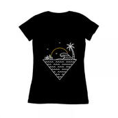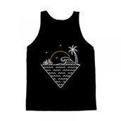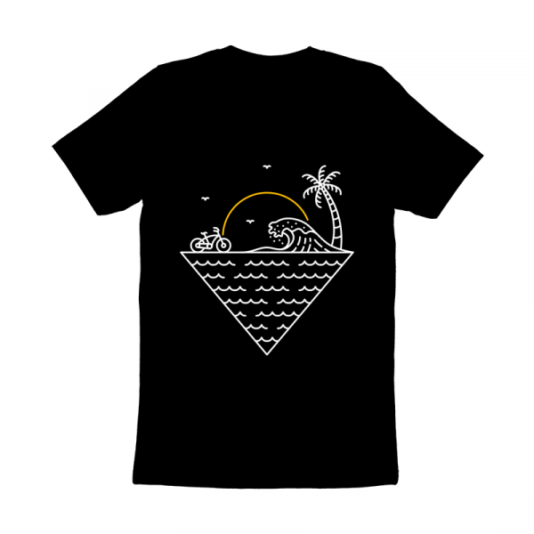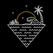 Cycling to the Waves is a monoline illustration that is suitable for apparel or merchandise about summer, vacation, holiday, travel, beach, sea, ocean, waves, surfing, tropical, bike, bicycle, biker, sunset, nature.