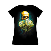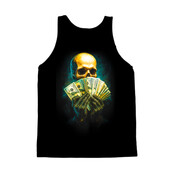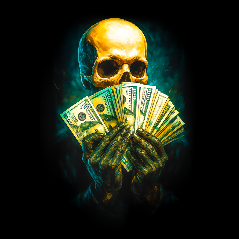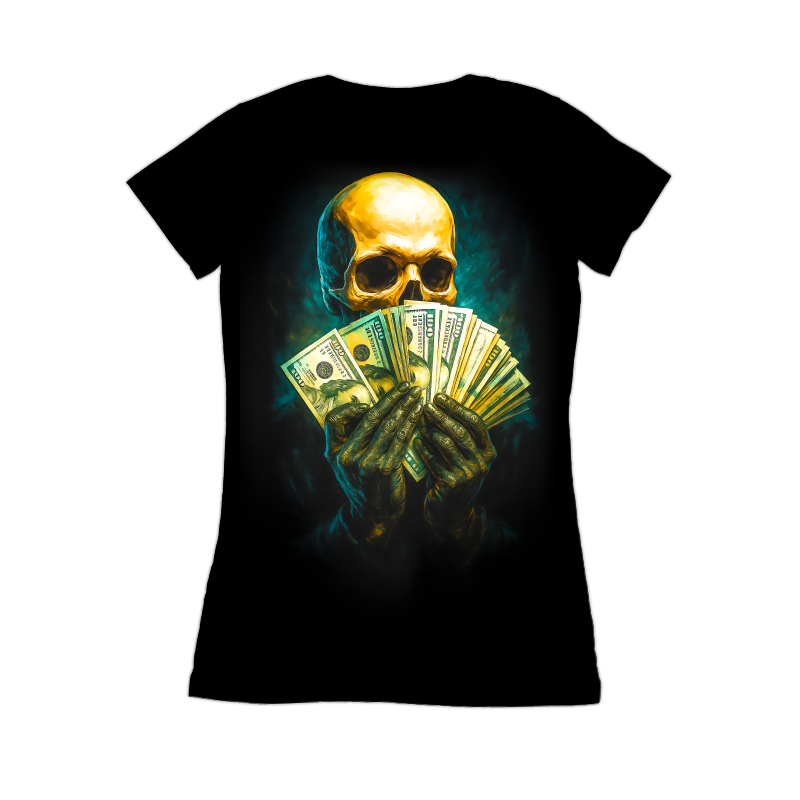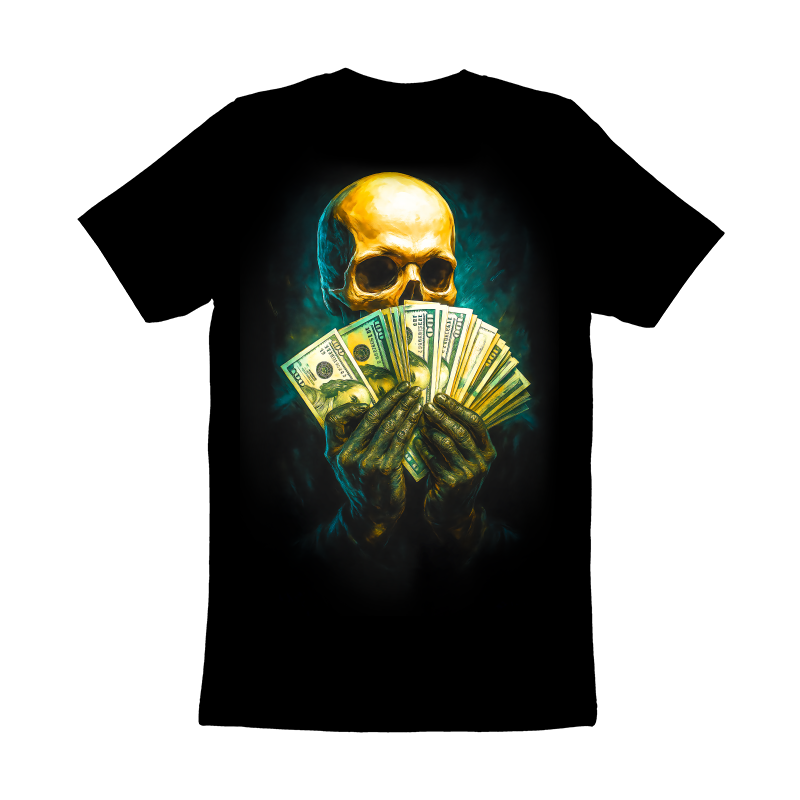 This design features a striking contrast between life and death, wealth and mortality. A golden skull, symbolizing the inevitable end, peers over a fan of crisp, green hundred-dollar bills. The hands holding the money are aged and textured, hinting at the fleeting nature of earthly possessions. The background is a swirl of dark blues and greens, adding to the somber yet intriguing atmosphere. The overall composition creates a powerful visual statement about the transient nature of wealth and the enduring presence of death. The design uses a dark color palette, with the gold skull and green money acting as focal points, drawing the viewer's eye to the central theme.
