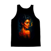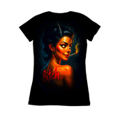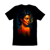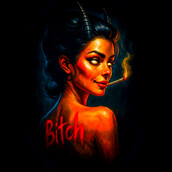 This striking design features a sultry devil woman, rendered in a vivid, almost hyperrealistic style. Her skin glows with fiery hues, contrasting with her dark hair and horns. She holds a lit cigarette, adding to her rebellious aura. The word 'Bitch' is emblazoned on her back in bold, red letters, adding an edgy, provocative element to the design. The overall aesthetic blends elements of pin-up art with a dark, gothic sensibility. The artist uses light and shadow to create depth and highlight her features, resulting in a captivating and slightly unsettling image. The details in her facial expression convey a sense of confidence and defiance.