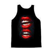 This striking design features a close-up, mirrored image of a pair of open mouths, each showcasing bright red lipstick and dazzling diamond-studded grillz. The artwork employs a bold, hyperrealistic style, emphasizing the glossy texture of the lips and the sparkling facets of the diamonds. The color palette is dominated by vibrant reds, stark whites, and the glittering silver of the grillz, set against a deep black background that enhances the contrast and visual impact. The mirrored composition adds a layer of symmetry and visual interest, drawing the viewer's eye to the intricate details of the teeth and the luxurious grillz. Overall, the design exudes a sense of confidence, glamour, and urban edge.