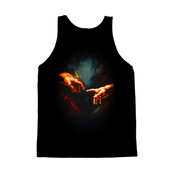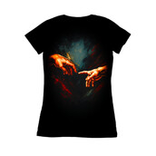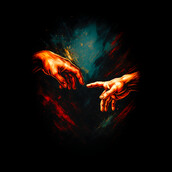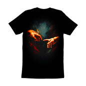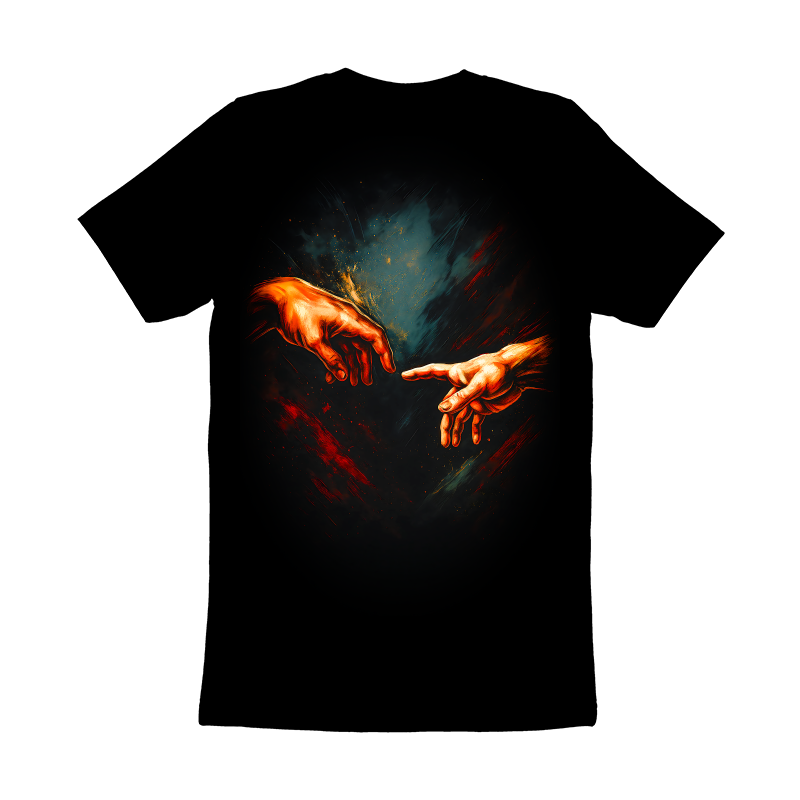 This artwork presents a dynamic reimagining of Michelangelo's "The Creation of Adam." The design showcases two hands reaching out, almost touching, against a backdrop of swirling colors reminiscent of cosmic dust and energy. The hands are rendered in vibrant oranges and reds, conveying warmth and life, while the background features cool blues and teals, creating a striking contrast. The overall effect is both classic and contemporary, blending Renaissance art with modern abstract expressionism. The design evokes themes of connection, creation, and the spark of life, making it a powerful and visually captivating piece.