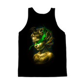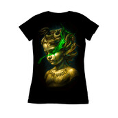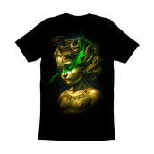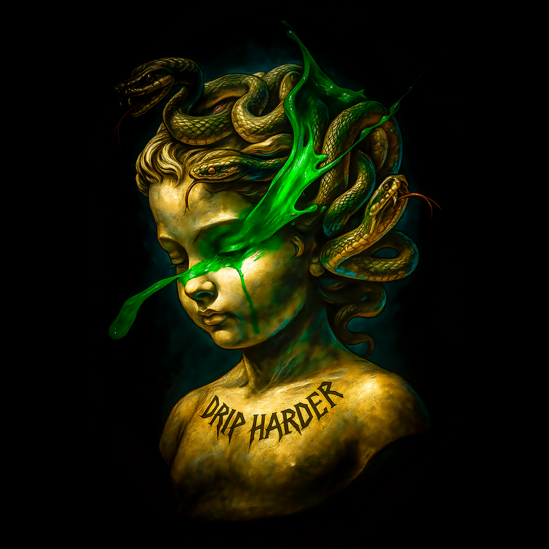 This design presents a modern take on the classic Medusa, blending ancient mythology with contemporary aesthetics. The iconic snake-haired Gorgon is depicted as a golden statue, with a vibrant green liquid, possibly slime or paint, dramatically cascading from her eyes. The phrase "DRIP HARDER" is emblazoned across her chest in a bold, stylized font, adding an edgy, urban twist. The statue-like texture of Medusa's skin contrasts sharply with the smooth, glossy texture of the green liquid, creating a visually striking effect. The overall composition balances classical art with modern street style, making it a versatile design for various applications.