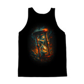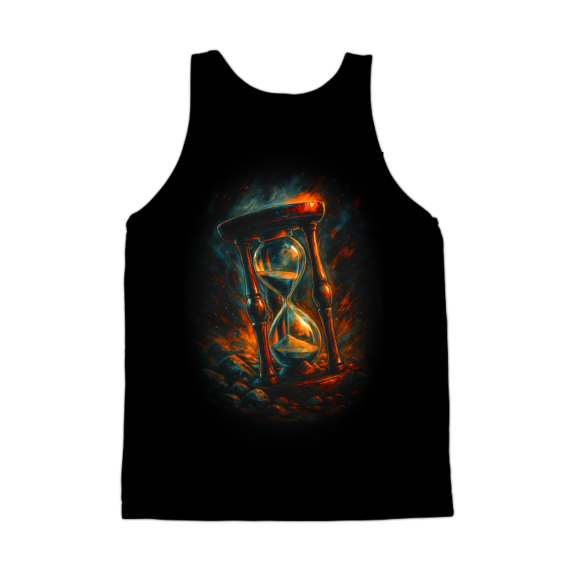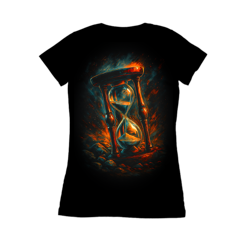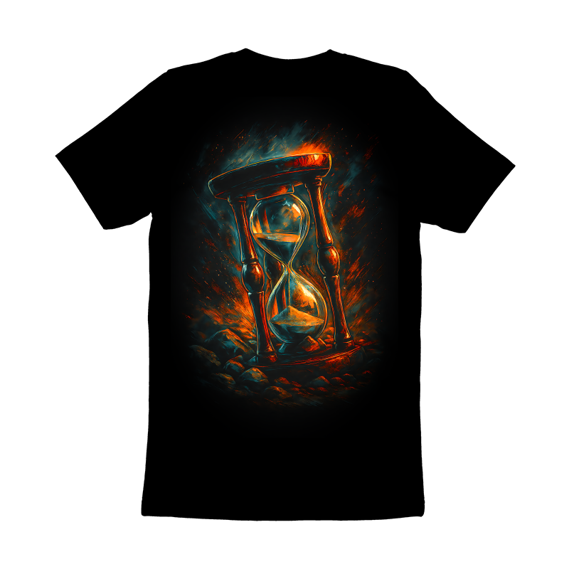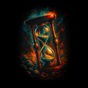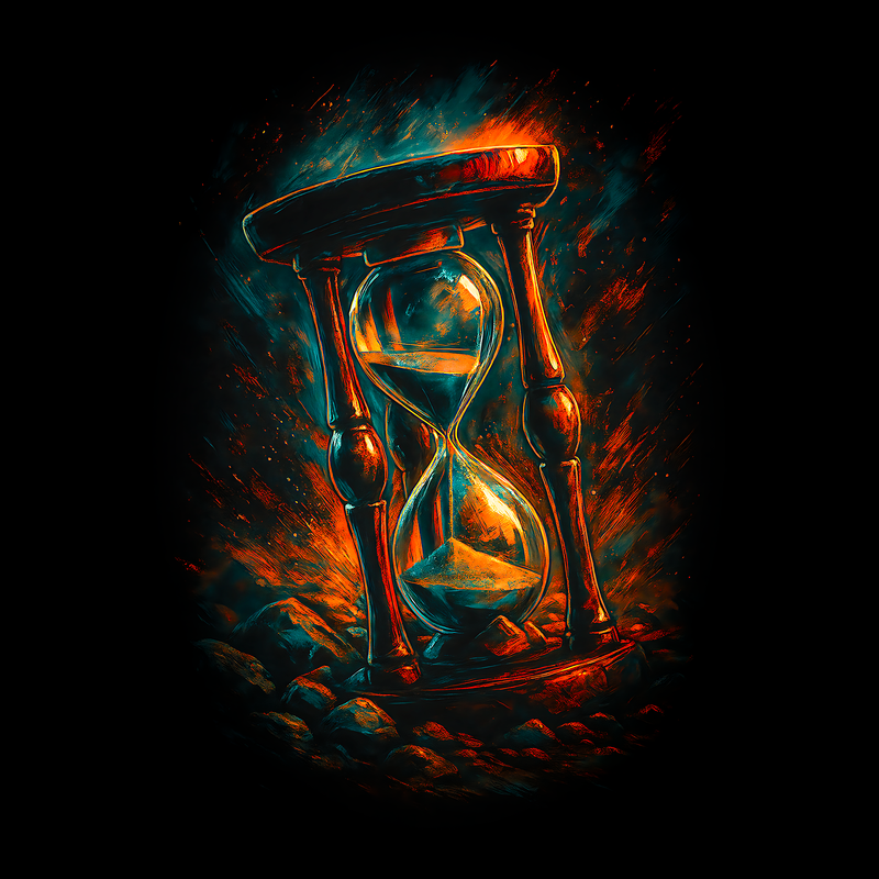 This artwork features a detailed hourglass, rendered in a style that blends realism with fantastical elements. The hourglass is the central focus, with sand flowing within its glass bulbs, symbolizing the passage of time. The color palette is rich and dramatic, using deep blues and vibrant oranges to create a sense of depth and contrast. The background is filled with swirling, nebulous patterns, adding an ethereal quality to the piece. The base of the hourglass rests on a rocky surface, grounding the image with a touch of realism. The overall effect is both striking and thought-provoking, inviting viewers to contemplate the nature of time and existence. The artwork would appeal to those interested in fantasy art and philosophical themes. Designers could use this striking image for book covers, posters, or website backgrounds, especially for projects related to fantasy, science fiction, or philosophical themes. The dramatic color scheme and detailed rendering make it suitable for high-impact visuals. It could also be incorporated into graphic designs for events or products that aim to evoke a sense of timelessness or mystery.