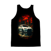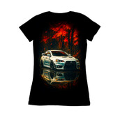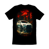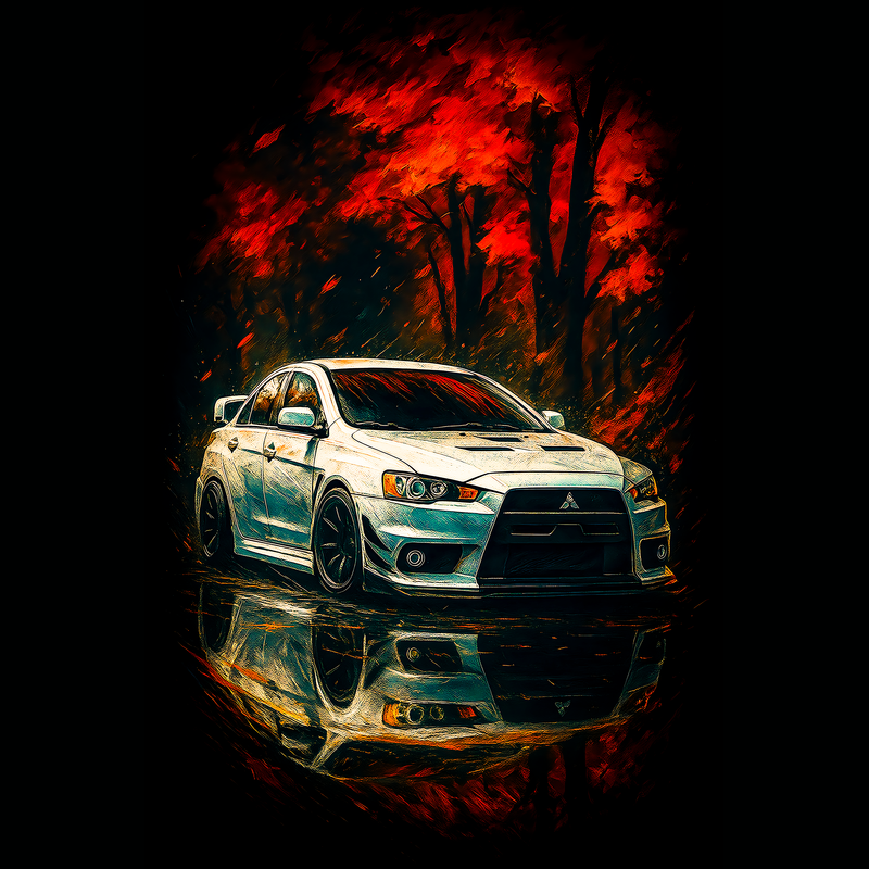 This artwork captures a Mitsubishi Lancer Evolution in a dynamic interplay of fiery aesthetics. The car, rendered in a blend of cool silvers and blues, stands out against a backdrop of fiery reds and oranges, creating a striking visual contrast. The reflection beneath the car adds depth, mirroring the vibrant chaos above. The style leans towards a modern, painterly effect, reminiscent of digital brush strokes, giving it an energetic and contemporary feel. The composition is dramatic, highlighting the car's sleek lines and aggressive stance, while the background suggests a blurred, abstract landscape, intensifying the focus on the vehicle. The overall effect is bold and intense, appealing to automotive enthusiasts and fans of dynamic digital art.