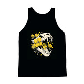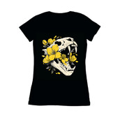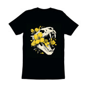 This captivating design features a stylized animal skull, possibly a feline, rendered in a clean, illustrative style. The skull is intricately detailed with visible sutures and teeth, contrasting sharply with the delicate yellow flowers that intertwine within its structure. The flowers, depicted with soft petals and detailed stamen, add a touch of beauty and fragility to the otherwise macabre subject. The color palette is limited to shades of off-white/beige for the skull and a vibrant yellow for the blossoms, set against a stark black background, enhancing the visual impact. The overall effect is a compelling juxtaposition of life and death, strength and vulnerability, making it a versatile design element for various applications.