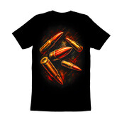 This striking design features a cluster of bullets, rendered in a dynamic and somewhat abstract style. The bullets are depicted in varying sizes and orientations, creating a sense of motion and depth. The color palette consists mainly of warm tones, with the bullets rendered in shades of gold, bronze, and red, giving them a metallic and fiery appearance. The background is dark, which accentuates the brightness and intensity of the bullets. The overall effect is one of power, danger, and precision. The design has a modern, edgy feel, making it suitable for a variety of applications.