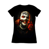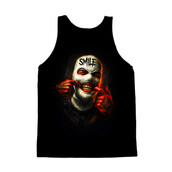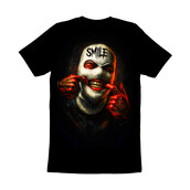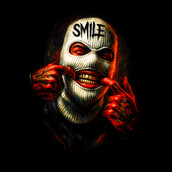 This design presents a chilling visual of a figure wearing a white ski mask, the word 'SMILE' scrawled across the forehead in jagged, unsettling letters. The eyes are shadowed and menacing, while the mouth is stretched into a grotesque smile, seemingly forced by blood-stained fingers. The overall aesthetic leans heavily into horror, with a gritty, textured style that enhances the disturbing nature of the subject. The color palette is dominated by dark tones, punctuated by stark whites and vivid reds, creating a sense of unease and dread. The design evokes elements of both urban grit and classic horror tropes, making it a striking and memorable piece.