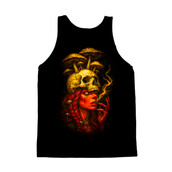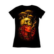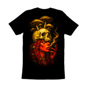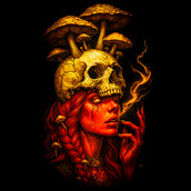 This dark fantasy image features a red-skinned woman with a skull adorned with mushrooms sitting atop her head. The skull, aged and yellowed, contrasts with the vibrant red of her skin. She is depicted in profile, with tears of blood streaking down her face, adding to the somber and macabre atmosphere. Her hair is styled in a thick braid, interwoven with small mushrooms, and she wears a detailed gold choker with mushroom accents. She holds a thin, glowing object between her fingers, emitting sparks of light, suggesting a connection to the supernatural or magical. The background is a stark black, which accentuates the vivid colors and intricate details of the subject. The overall style is reminiscent of dark fantasy art, with a blend of horror and mystical elements.