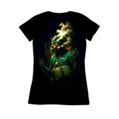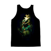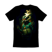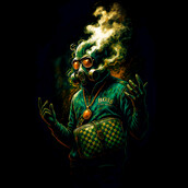 This striking image features a figure clad in a gas mask, exuding an aura of urban sophistication and streetwise confidence. The gas mask, partially obscured by stylized smoke, adds an element of mystery and intrigue, while the designer tracksuit and checkered crossbody bag hint at a high-fashion sensibility. A chunky gold chain and medallion complete the ensemble, reinforcing the 'boss' aesthetic. The color palette is rich and vibrant, with deep greens and golds contrasting against the dark background, creating a visually arresting composition. The overall effect is both edgy and refined, suggesting a character who navigates the gritty realities of urban life with style and swagger.