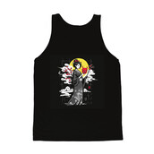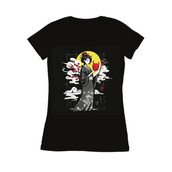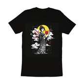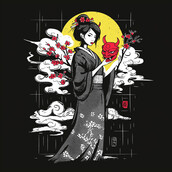 This striking design features a geisha in a traditional kimono, holding a vibrant red Oni mask. The geisha is depicted with delicate features and an elegant hairstyle adorned with flowers. Her kimono is patterned with white blossoms, contrasting against the dark fabric. The Oni mask, with its horns and fierce expression, adds a layer of mystique and contrast to the serene figure. The background includes stylized clouds, a full moon, and subtle vertical lines suggesting rain or an enclosed space. The overall aesthetic blends traditional Japanese art with modern graphic design elements, creating a visually compelling and culturally rich image. The color palette is limited, focusing on black, white, red, and a muted yellow, enhancing the design's impact and visual harmony.