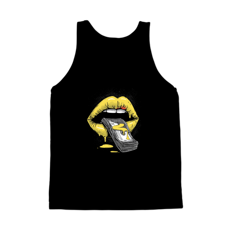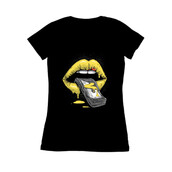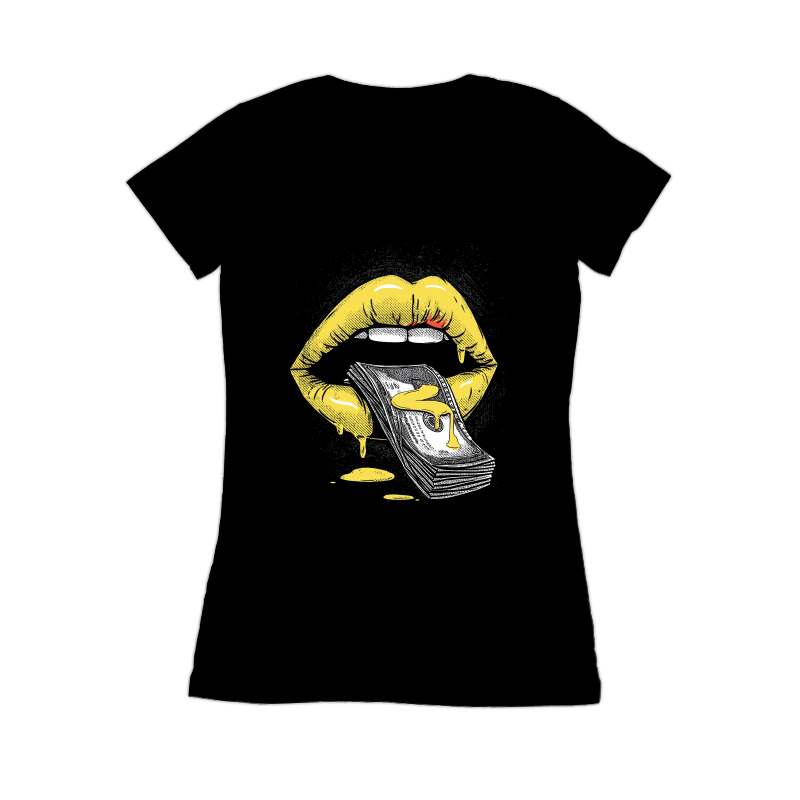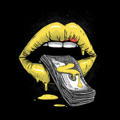 This striking vector art piece features a pair of luscious lips, rendered in a vibrant, almost dripping gold, greedily consuming a stack of American dollar bills. The contrast between the glossy, stylized lips and the detailed, monochrome money creates a visually arresting image. The design employs a halftone effect, adding a retro, pop-art feel. Splatters of gold 'sauce' further emphasize the theme of indulgence and wealth. The overall composition is bold and provocative, hinting at themes of consumerism, desire, and the allure of money. The stark black background intensifies the visual impact, making the golden elements pop. The style is reminiscent of classic comic book art with a modern, edgy twist.