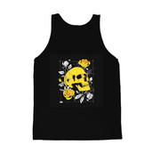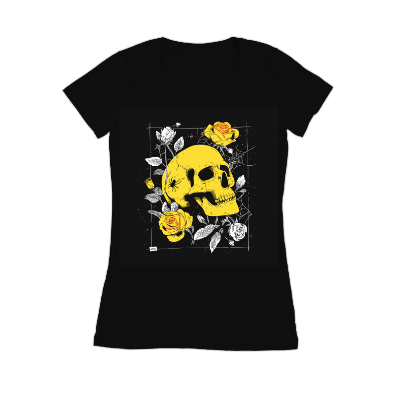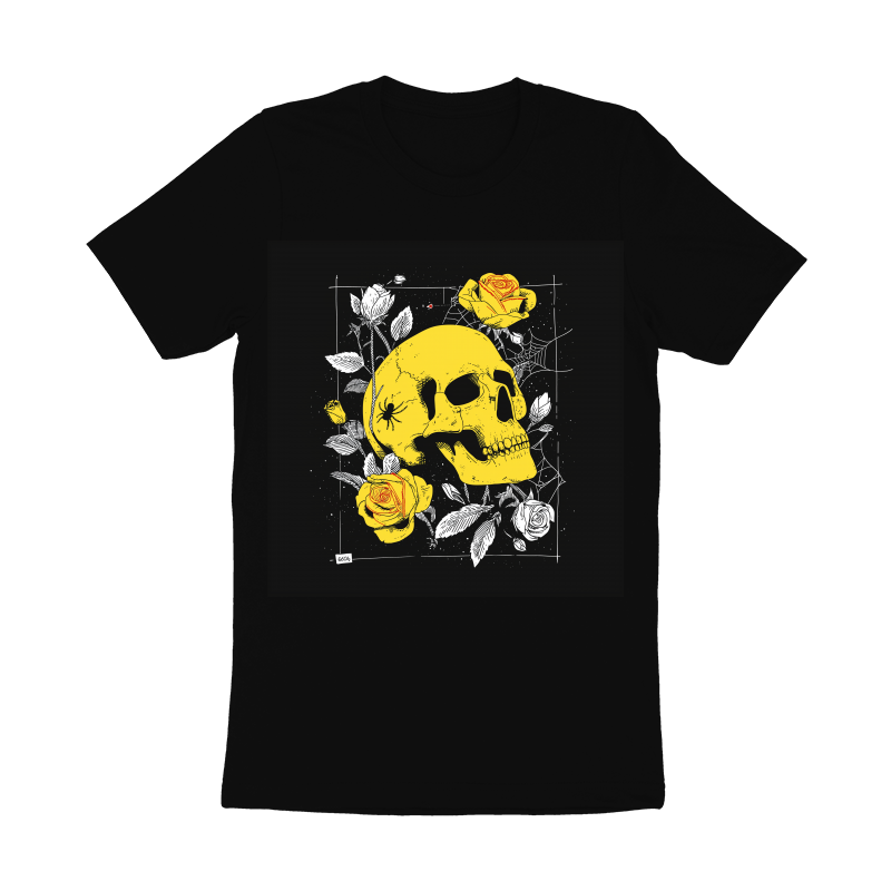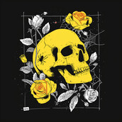 This design presents a striking contrast between life and death, beauty and decay. A golden skull, rendered in a detailed, slightly distressed style, is the central focus. It's adorned with a small spider crawling across its surface. Surrounding the skull are roses in varying stages of bloom, some in shades of white and others mirroring the skull's golden hue. Delicate spiderwebs add a touch of macabre elegance. The composition is framed by a minimalist rectangular border, giving it a modern edge. The color palette is limited to gold, white, and black, enhancing the design's visual impact and creating a bold, graphic aesthetic. The overall effect is both captivating and slightly unsettling, making it a unique and memorable piece.