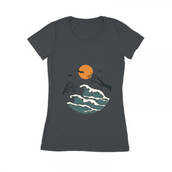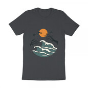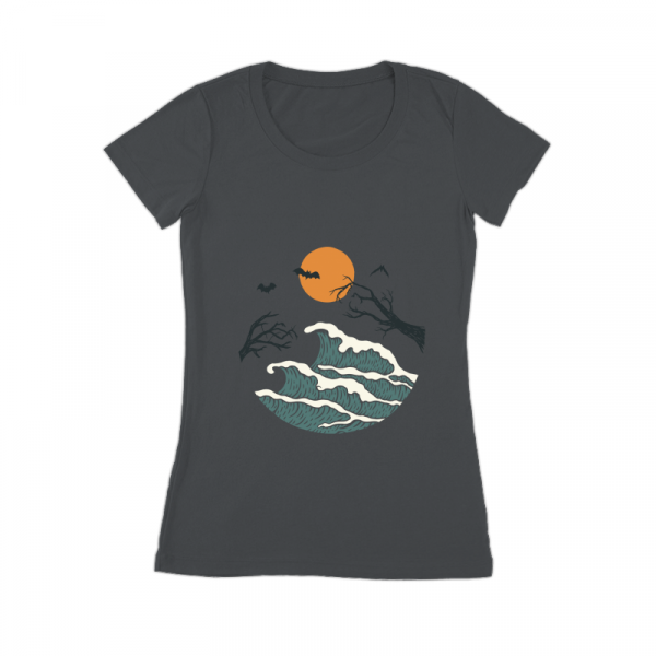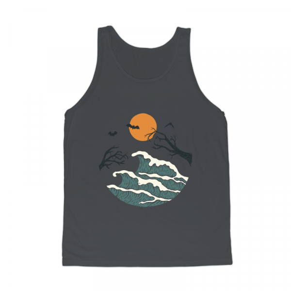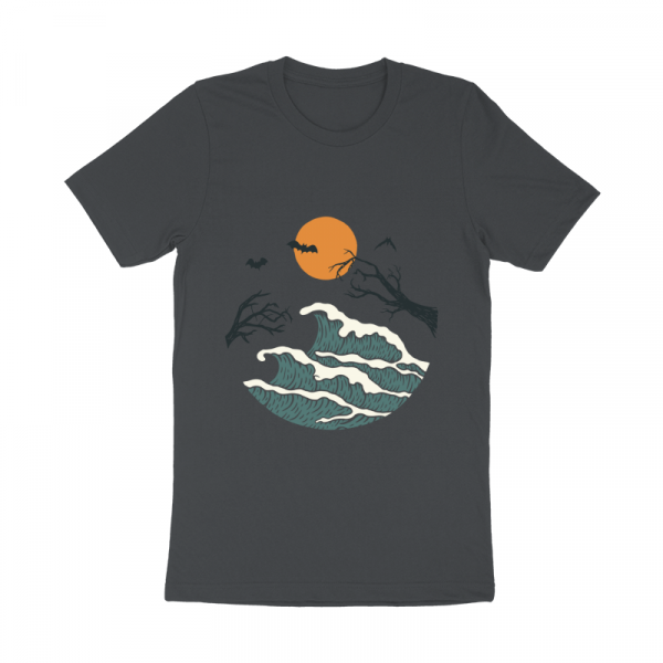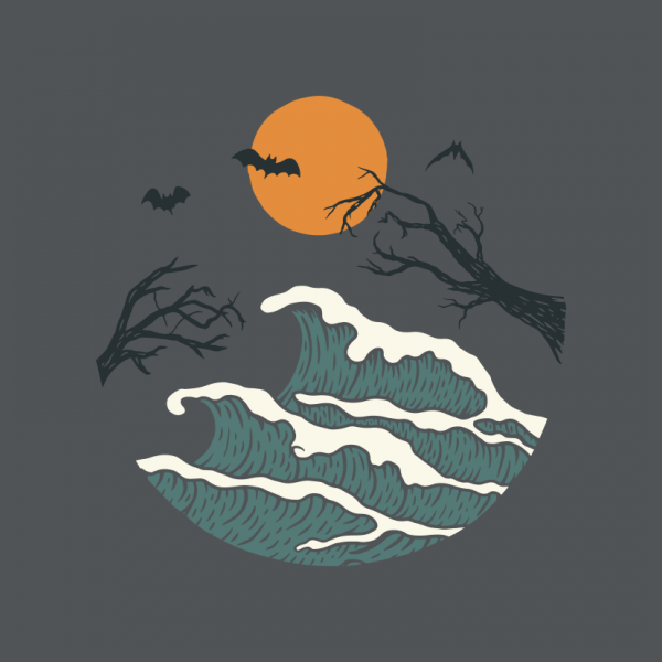 Halloween Waves is a vintage illustration that is suitable for t-shirts, jackets, or merchandise with the theme of halloween, skull, horror, ghost, pumpkin, bat, hell, graveyard, grim reaper, trick or treat, beach, sea, ocean, waves, kanagawa.