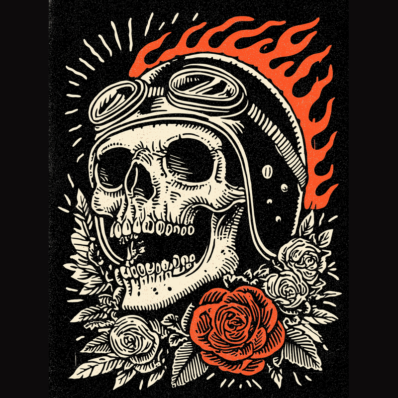 This striking design features a skull wearing a vintage biker helmet and goggles, adorned with stylized flames and roses. The artwork employs a bold, contrasting color palette of black, white, and orange, creating a visually arresting image. The skull is intricately detailed, with careful attention paid to the bone structure and texture. The helmet adds a touch of retro cool, while the flames suggest speed and danger. The roses provide a contrasting element of beauty and fragility, creating a compelling juxtaposition. The overall style is reminiscent of classic tattoo art and vintage motorcycle graphics, making it ideal for designs that require a rebellious and edgy aesthetic. The design has a slightly distressed texture, adding to its vintage appeal.