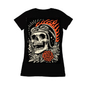 Designers can use this image for a variety of projects, including t-shirt designs, posters, and logos. Its vintage biker aesthetic makes it perfect for brands targeting motorcycle enthusiasts or those seeking a rebellious and edgy image. The combination of skull, flames, and roses offers a unique and visually appealing design element that can be easily incorporated into various layouts and compositions.