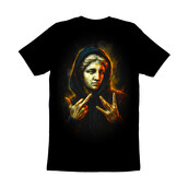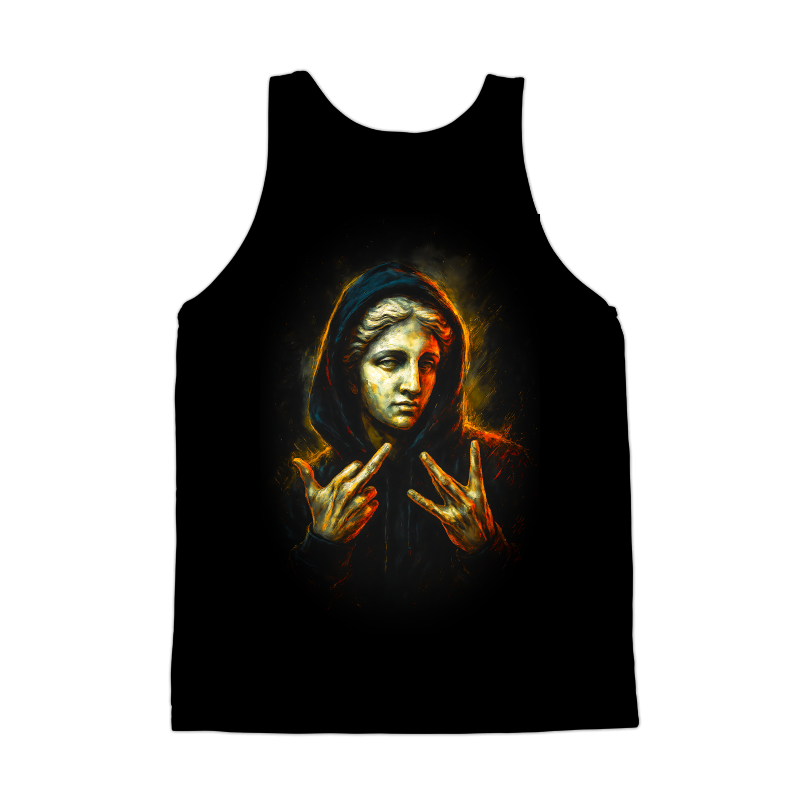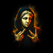 This design presents a striking juxtaposition of classical art and contemporary urban style. It features a marble statue bust, reminiscent of ancient Greek or Roman sculpture, but unexpectedly cloaked in a modern hooded sweatshirt. The statue's serene expression contrasts with the casual attire, creating a visually intriguing and thought-provoking image. The color palette utilizes warm oranges and yellows against a dark background, lending a dramatic and edgy feel. The overall effect is a fusion of timeless elegance and streetwise cool, appealing to audiences interested in art, fashion, and cultural mashups. The design has an artistic and edgy vibe.