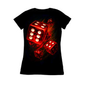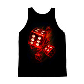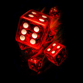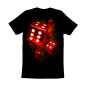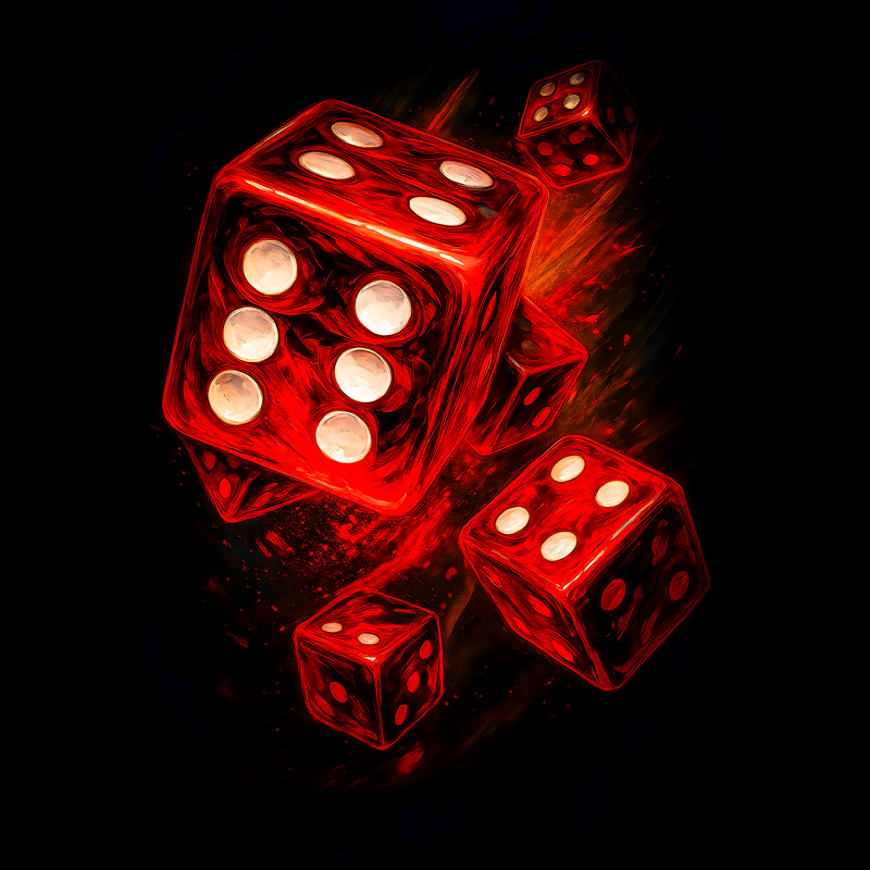 This striking design features a cluster of dice rendered in a fiery red and black color scheme, set against a stark black background. The dice appear to be in motion, perhaps tumbling through the air, with trails of fiery energy emanating from their edges. The color palette is dominated by shades of red, creating a sense of heat and intensity. The dice themselves are intricately detailed, with each pip clearly defined. This design would be ideal for use in a variety of contexts, from gaming-related merchandise to edgy, urban-inspired apparel. The overall effect is both visually arresting and conceptually intriguing.