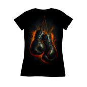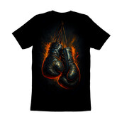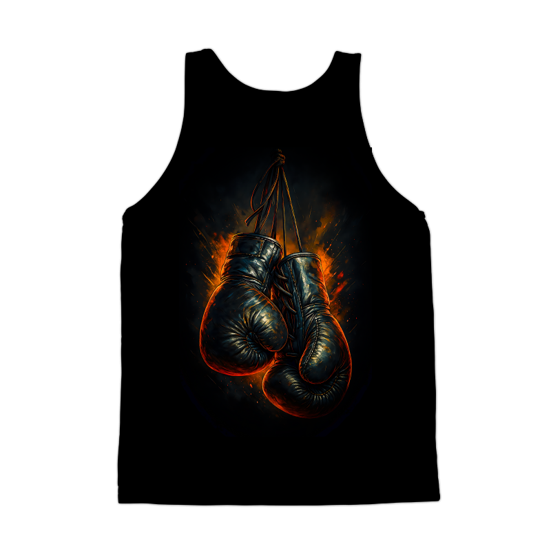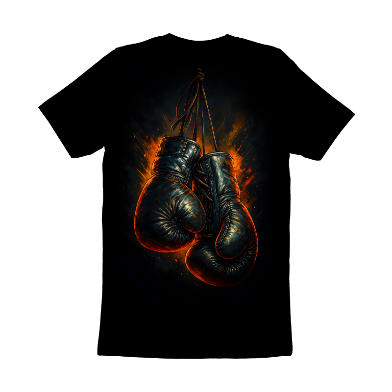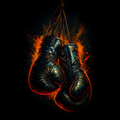 This striking design features a pair of vintage boxing gloves, rendered with a dynamic and gritty aesthetic. The gloves, depicted in dark tones with hints of gold and red, hang against a backdrop of fiery bursts, creating a sense of intense energy and raw power. The textures are rich and detailed, giving the gloves a worn, battle-tested appearance that adds to the design's vintage charm. The overall composition evokes a sense of nostalgia and the timeless appeal of classic boxing. The artistic style blends elements of realism with abstract expressionism, making it visually compelling and versatile for various applications. This design captures the essence of strength, resilience, and the enduring spirit of the sport.