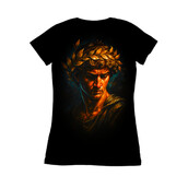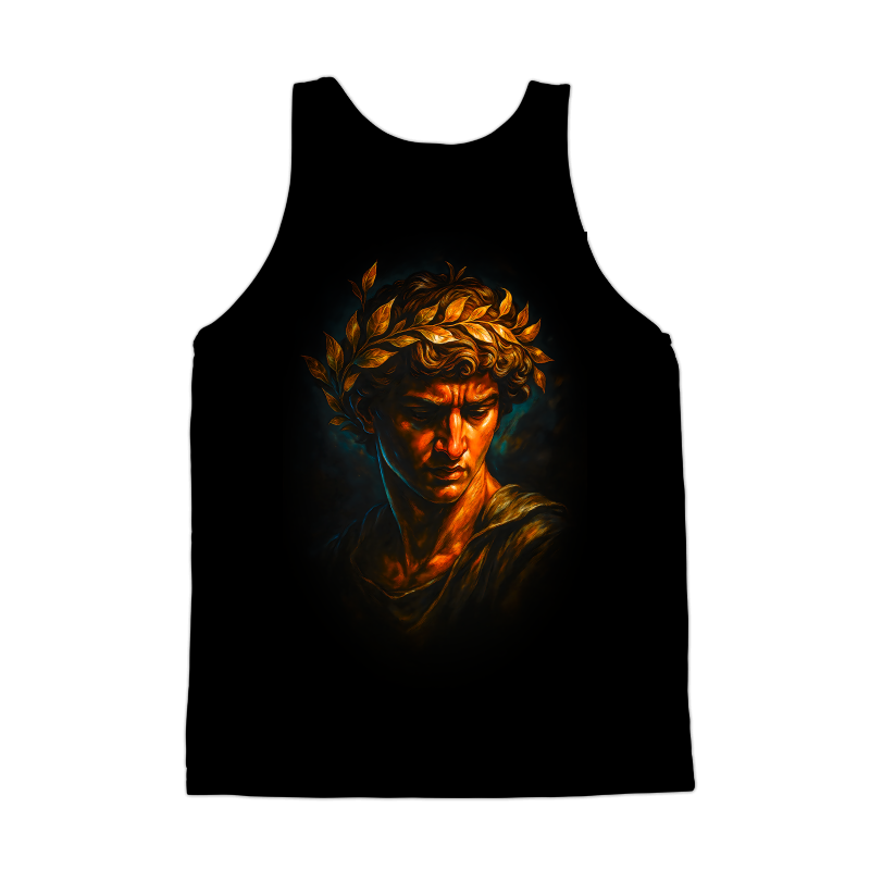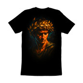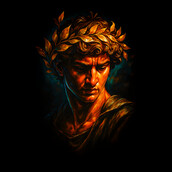 This artwork depicts a young man, possibly a Roman or Greek figure, adorned with a laurel wreath, a symbol of victory and honor. The man's gaze is directed downwards, suggesting a moment of deep contemplation or introspection. The color palette is dominated by warm tones, with oranges and yellows highlighting the subject's face and the golden leaves of the wreath. The background is dark, creating a dramatic contrast that draws the viewer's attention to the figure. The style is reminiscent of classical portraiture, with a modern, painterly touch, giving it a timeless yet contemporary feel. The lighting is carefully crafted, emphasizing the contours of the face and adding depth to the overall composition. There is a sense of gravitas and solemnity conveyed through the subject's expression and the overall artistic treatment.