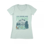Less Working, More Fishing is a vintage illustration that is suitable for t-shirts, jackets, or merchandise with the theme of fish, fishing, nature, outdoors, animal, wildlife, adventure, travel, mountain, fisherman, wildlife, vacation, river, hunting, wyoming.