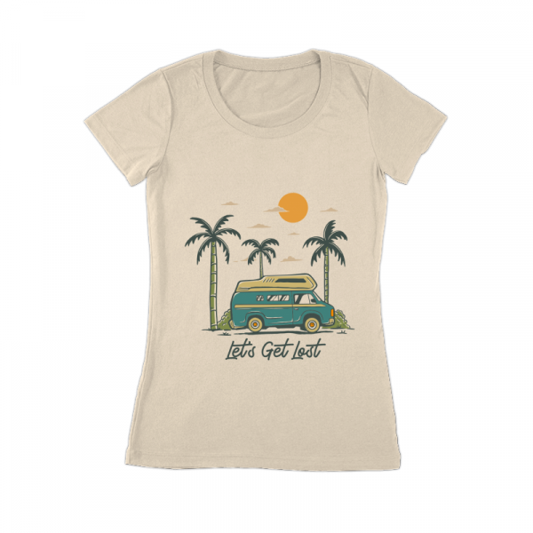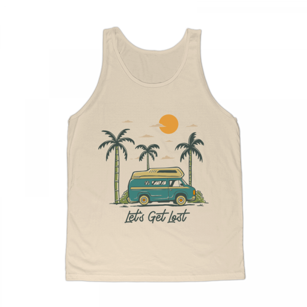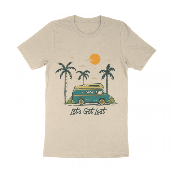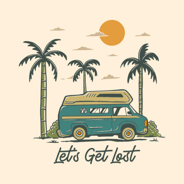 Let's Get Lost Van Adventure is a vintage illustration that is suitable for t-shirts, jackets, or merchandise with the theme of combi, nature, volkswagen, caravan, van, vehicle, adventure, roadtrip, trip, travel, summer, vacation, holiday, outdoors, camping.