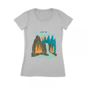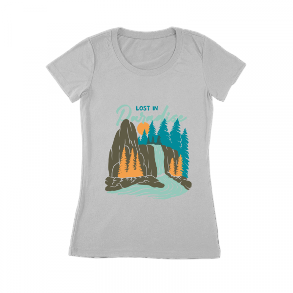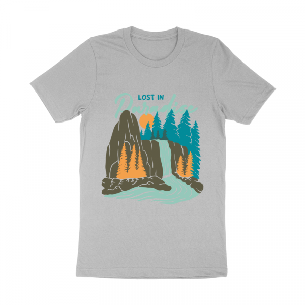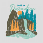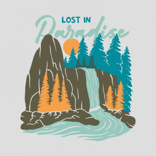 Lost in Paradise is a vintage illustration that is suitable for apparel or merchandise about nature, outdoors, adventure, mountain, paradise, falls, national park, summer, tropical, vacation, holiday, waterfall.