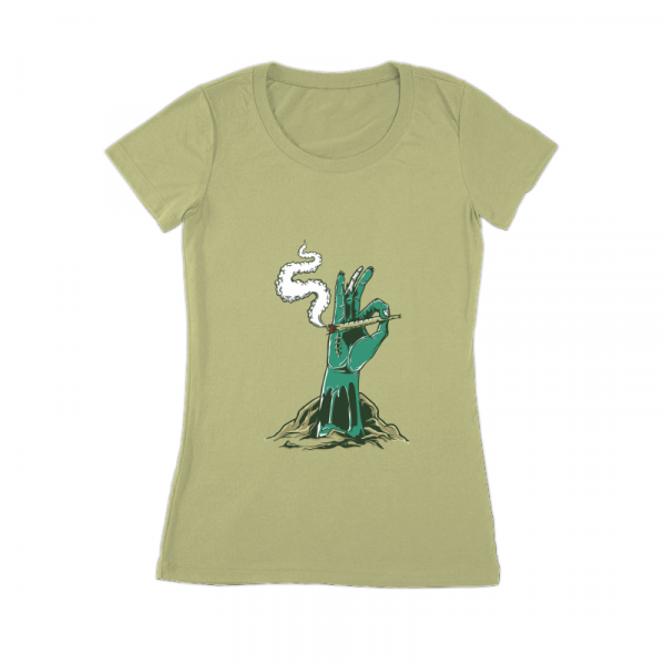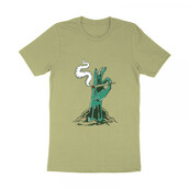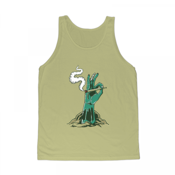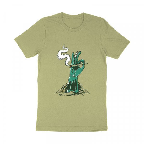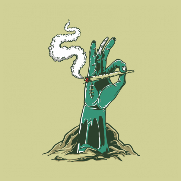 Marijuana in Zombie's Hand is a vintage illustration that is suitable for apparel or merchandise about monster, zombie, halloween, horror, skull, skeleton, scary, smoke, weed, bud, marijuana, cannabis, cigarette.