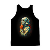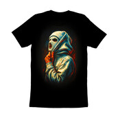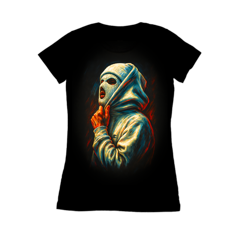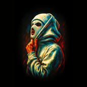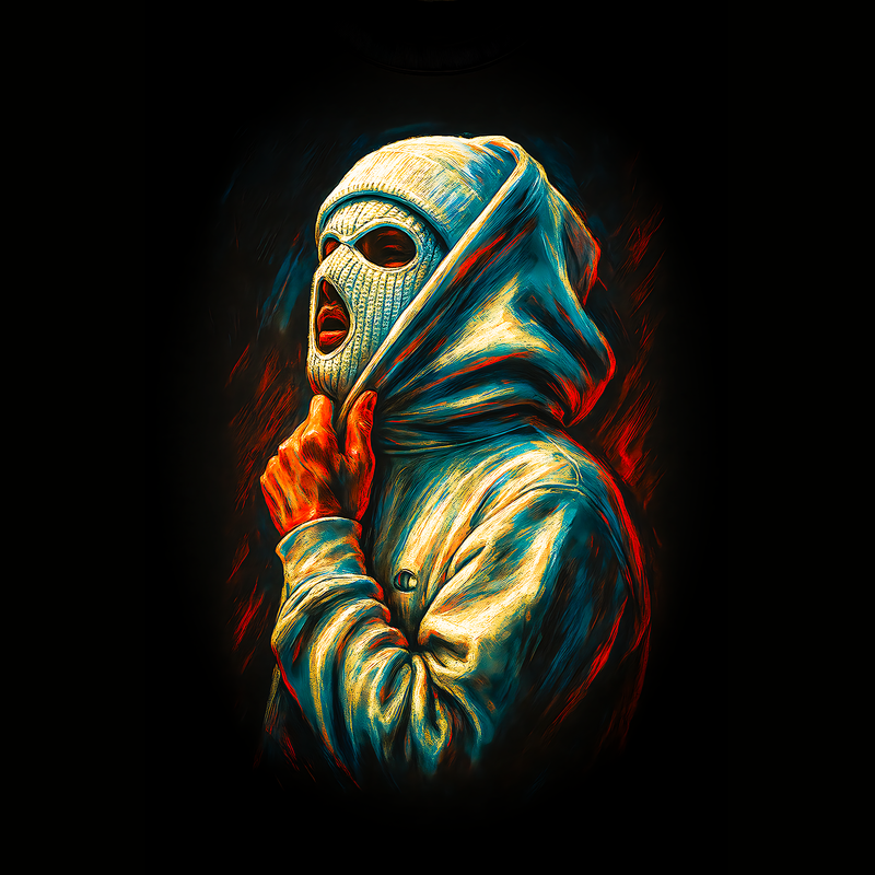 This striking design features a figure wearing a balaclava, partially revealing their face in a dramatic pose. The artwork employs a vivid color palette, with blues, oranges, and yellows blending to create a sense of depth and intensity. The subject is depicted in a hoodie, adding a contemporary urban element to the composition. The contrasting colors highlight the textures of the knitted mask and the fabric of the hoodie, giving the design a tactile quality. The overall effect is both intriguing and slightly unsettling, drawing the viewer in to contemplate the identity and intentions of the masked individual. The use of light and shadow enhances the three-dimensional appearance of the figure, making it stand out against the dark background.