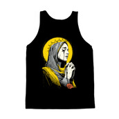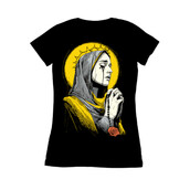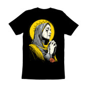 This evocative illustration depicts Mater Dolorosa, the Weeping Virgin, in a sorrowful pose. The artwork features a limited color palette of yellow, grey, and black, enhancing its dramatic impact. The Virgin is shown in profile, her head covered by a veil, with tears streaming down her face. A halo of thorns encircles her head, set against a bright yellow backdrop. She clasps a rosary in her hands, with a single rose adorning the bottom of the image. The design incorporates detailed line work and shading, reminiscent of vintage engravings and tattoo art. The overall effect is both reverent and emotionally powerful, making it suitable for a variety of artistic and commercial applications.