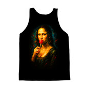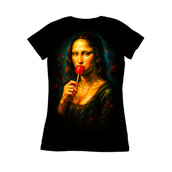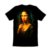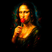 This artwork presents a contemporary take on Leonardo da Vinci's iconic Mona Lisa, infusing it with a playful and modern twist. The classic Renaissance portrait is reimagined with vibrant, painterly strokes and a bold color palette, giving it a pop art feel. Instead of her enigmatic smile, Mona Lisa is depicted enjoying a bright red lollipop, adding a touch of whimsy and humor to the composition. The background features a dark, moody atmosphere with splashes of color, enhancing the contrast and drawing the viewer's eye to the subject. This fusion of classic art and modern pop culture creates a visually striking and thought-provoking piece, appealing to a wide audience. The design retains the elegance and mystery of the original while injecting a fresh, contemporary vibe.