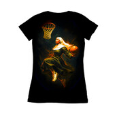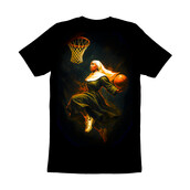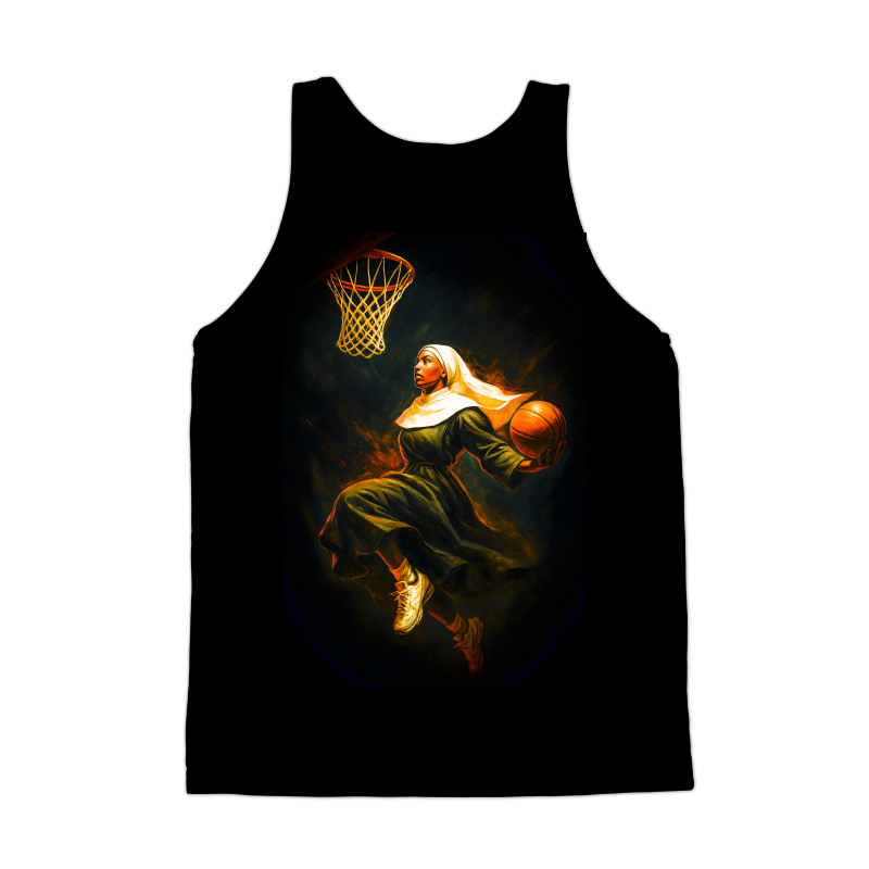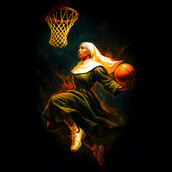 This dynamic artwork features a nun in full habit, mid-air, skillfully dribbling a basketball as she prepares to make a slam dunk. The piece juxtaposes religious iconography with the high-energy world of sports, creating a visually striking and thought-provoking image. The color palette is rich and vibrant, with fiery oranges and yellows contrasting against the dark background, emphasizing the movement and intensity of the scene. The style blends elements of realism with a touch of abstract expressionism, giving the piece a modern and edgy feel. The artist has captured the essence of athleticism and spiritual devotion in a single frame, making it a unique and compelling design.