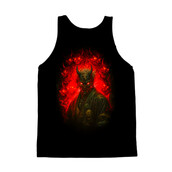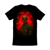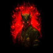 This image plunges viewers into a world of Japanese folklore and dark fantasy, showcasing a fearsome Oni amidst a fiery aura. The central figure, rendered in shades of green and yellow, sports sharp horns, piercing red eyes, and a menacing grin. He is adorned in a traditional robe with subtle skull motifs, hinting at his malevolent nature. Surrounding the Oni are multiple demonic faces engulfed in flames, their red eyes glaring intensely, amplifying the sense of dread and chaos. The composition is a masterful blend of traditional Japanese aesthetics and horror elements, creating a visually striking and unsettling piece. The use of light and shadow adds depth and dimension, enhancing the overall impact of the design. This artwork evokes a sense of ancient evil and supernatural power, capturing the essence of the Oni legend.