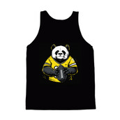 This striking design features a panda bear dressed in a yellow and grey football uniform, complete with the number '11' on the shoulder. The panda is holding an American football, its claws gripping the ball tightly. The artwork is rendered in a bold, graphic style with strong lines and a limited color palette, creating a visually impactful image. The black background emphasizes the panda's contrasting colors and adds a modern touch. The design blends the cuteness of a panda with the intensity of American football, resulting in a unique and eye-catching piece. The style is reminiscent of vintage sports posters with a contemporary twist.