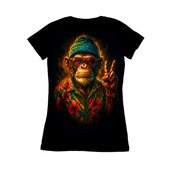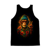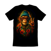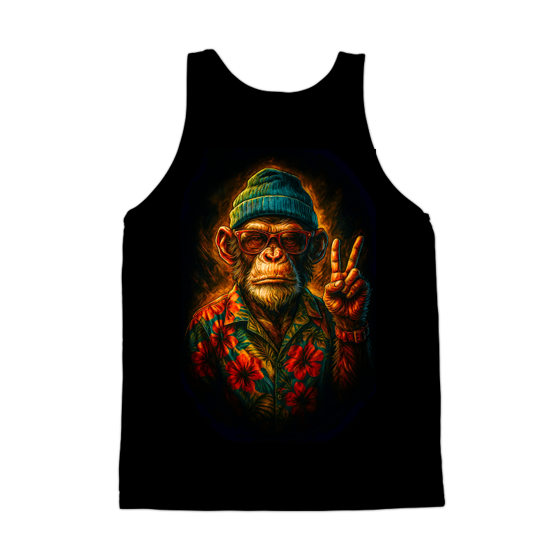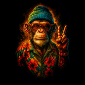 This striking design features a chimpanzee exuding cool vibes. The chimp is depicted wearing a teal beanie and red-framed glasses, giving it an intellectual, hipster look. Adding to the laid-back aesthetic, the chimp sports a vibrant Hawaiian shirt with red hibiscus flowers and green foliage. The chimp is throwing a peace sign. The artwork is rendered in a style reminiscent of neo-expressionism, with bold outlines and a vivid color palette that creates a visually arresting image. The background is a dark gradient, which makes the colors pop. This design balances playful charm with a touch of edgy sophistication.