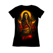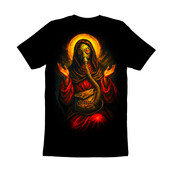 Designers could use this for striking apparel designs, particularly for the alternative or streetwear markets. It would also work well for album art, posters, or even as a unique logo for brands with an edgy or apocalyptic theme. The design's blend of religious and dystopian elements makes it versatile for various media.