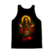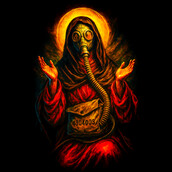 This design merges religious iconography with a dystopian, post-apocalyptic aesthetic. The central figure, reminiscent of a saint, is garbed in robes but wears a gas mask, creating a striking contrast between the sacred and the profane. A halo glows behind the figure, juxtaposed with the harsh reality of the gas mask and a bag with a numerical code, possibly symbolizing identification or a mark of survival in a ravaged world. The color palette is rich, with deep reds and oranges that evoke both warmth and danger. The overall effect is a powerful commentary on faith and survival in the face of environmental or societal collapse, blending elements of horror and religious art.