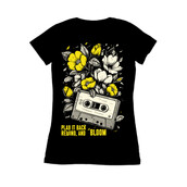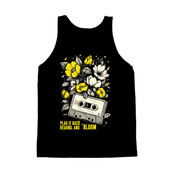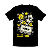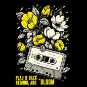 This design features a vintage cassette tape intertwined with blooming flowers. The cassette tape is rendered in a detailed, line-art style, giving it a retro and nostalgic feel. The flowers, depicted in shades of yellow and white, add a touch of natural beauty and vibrancy to the composition. The contrast between the mechanical object and the organic floral elements creates a visually striking and thought-provoking image. The phrase "Play it back, rewind, and bloom" is incorporated into the design, adding a layer of depth and meaning. The overall aesthetic is a blend of vintage and contemporary styles, making it appealing to a wide audience.