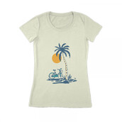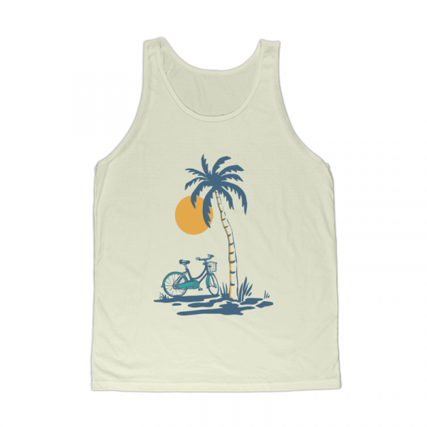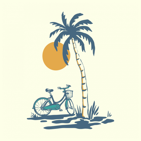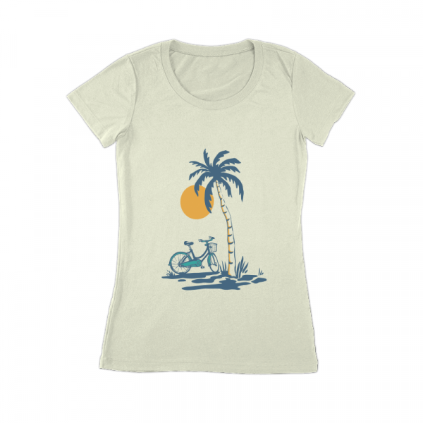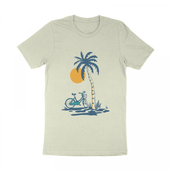 Ride and Shine is a vintage illustration that is suitable for apparel or merchandise about beach, sea, summer, vacation, holiday, travel, tropical, bike, bicycle, ride, sunset.
