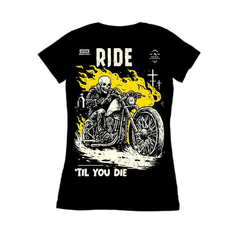 This striking design features a skeleton riding a motorcycle, rendered in a bold, graphic style with a limited color palette of black, white, and yellow. The skeleton, clad in a biker jacket, grips the handlebars with bony hands, exuding a sense of speed and rebellion. Flames erupt from behind the motorcycle, adding to the intensity of the scene. Tombstones are visible in the background, reinforcing the 'Ride 'Til You Die' theme. The design incorporates a distressed texture, giving it a vintage, worn look. The typography is simple and impactful, complementing the overall aesthetic. The composition is dynamic, drawing the viewer's eye to the central figure and conveying a sense of movement and danger.
